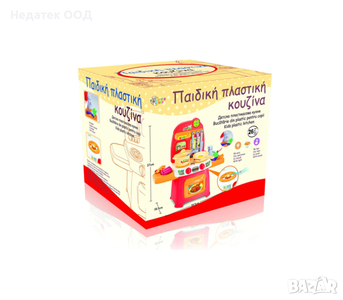 Мини кухня с височина 37 см, с чешма, която тече вода, фурна с бутон, който отваря вратата и много аксесоари.Лесен за сглобяване.Работи с 2 батерии АА (не са включени).