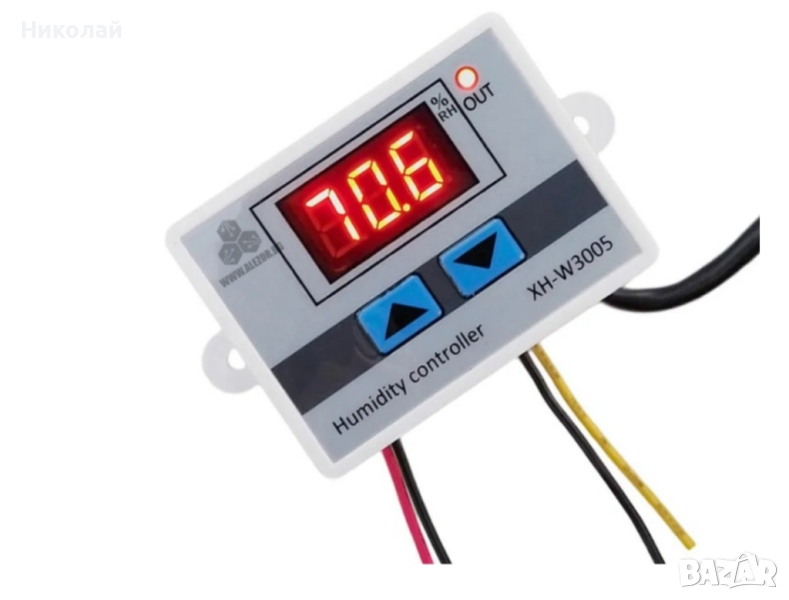 Влагорегулатор който е изключително удобен за работа и лесен за настройка. Настройва се стойности на влажност за включване и изключване, без да има ограничение в диапазона между тях. Директен изход с напрежение 220V за свързване на устройства до 1500W които ще бъдат управлявани. Контролера на влажност разполага с енергонезависима памет за запазване на направените настройки след спиране на захранващото напрежение. Меню за калибриране показанието на влагомера като се задържат двата бутона едновременно.