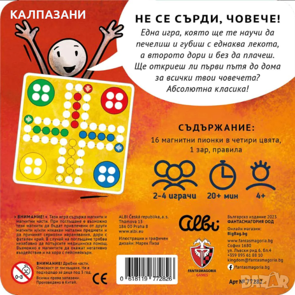 Не се сърди, човече! е игра, която ще те научи да печелиш и да губиш с еднаква лекота, а второто дори и без да плачеш. Ще откриеш ли първи пътя до дома за всички твои човечета? Играта е част от поредицата "Вечните класики в джобен формат" и е магнитна версия на любимата вечна класика в игрите. Кутийката е лека, малка и компактна. Много тънка, тя влиза без проблем във всяка раница или джоб, за да можеш да я вземеш навсякъде.