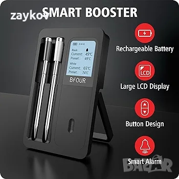БУСТЕР С LCD ДИСПЛЕЙ: Наблюдавайте температурите в реално време на големия екран на бустера по всяко време, без да се консултирате с приложението. Той е видим, зарежда се и се управлява дистанционно. Прави готвенето по-лесно и удобно.