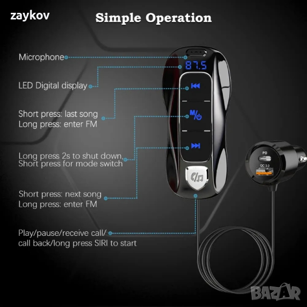 【2 интелигентни USB порта - PD 30W+ QC 3.0】 ✿ Bluetooth предавателят е свързан към запалката. Има 2 USB порта: PD 30W + QC3.0, който зарежда 4 пъти по-бързо. Можете да зареждате едновременно 2 съвместими устройства. Като телефони, таблети, USB устройства и др.