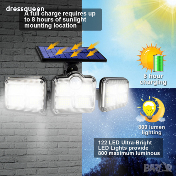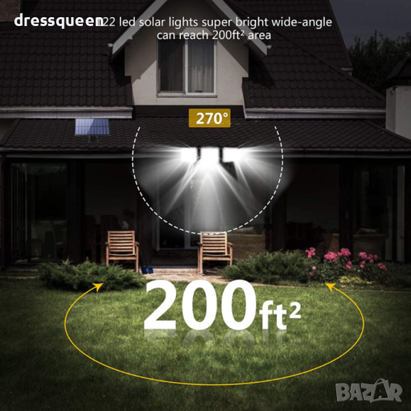 Лампата с вградени 122 COB светодиода, благодарение на вградения сензор за движение и здрач, ще се включи автоматично при засичане на движение, само когато се стъмни. В допълнение, лампата може да свети през цялото време или да се включва и изключва само при засичане на движение на разстояние от около 5 метра. Благодарение на това вече не е нужно да помните да включвате и изключвате светлината навън.