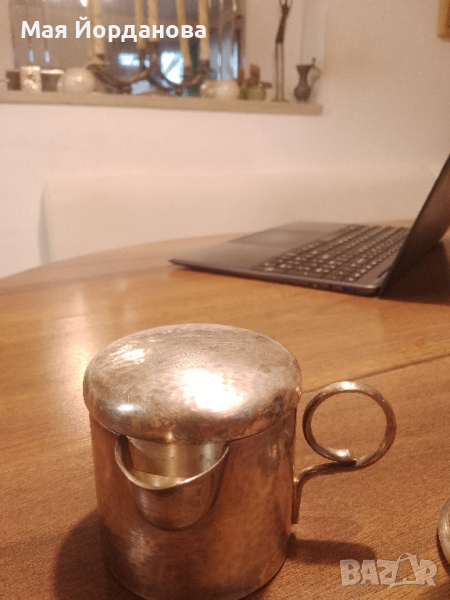 Посребрен съд за масло-25 лв (продаден). Посребрена бензинова настолна запалка с невероятни инкрустации-32 лв. Комплект посребрени захарница-дозатор и каничка за мляко-23 лв. перфектно покритие. Масивна посребрена чаша-16 лв.(продадена). Съдчето за масло ПРОДАДЕНО!