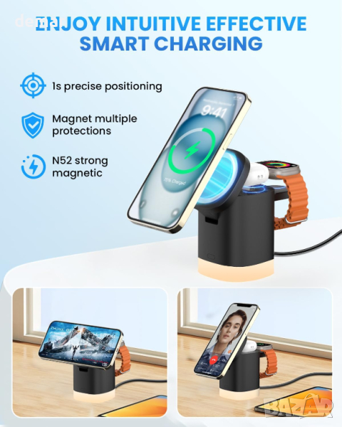 Безжичното зарядно устройство JoyGeek iPhone 15 предлага широка съвместимост със серия iPhone 15-12, Apple Watch Ultra 2 до Series 2, SE и AirPods Pro 2 до AirPods 2, подобрявайки зареждането с магнитни калъфи. Неговата функция за магнитно зареждане осигурява прецизно подравняване за надеждно и бързо зареждане. Тази 3-в-1 безжична станция за зареждане премахва бъркотията, като зарежда вашите iPhone, AirPods и iWatch едновременно, идеална за пътуване със своя сгъваем, лек дизайн. Той може да се похвали с регулируем ъгъл на гледане до 45° за оптимално използване на бюро и конферентни разговори, допълнен от регулируема нощна светлина с опции за топло и положително бяло, идеална за използване в спалнята. Безопасността е гарантирана с CE и FCC сертификати, осигуряващи безпроблемно изживяване при зареждане.