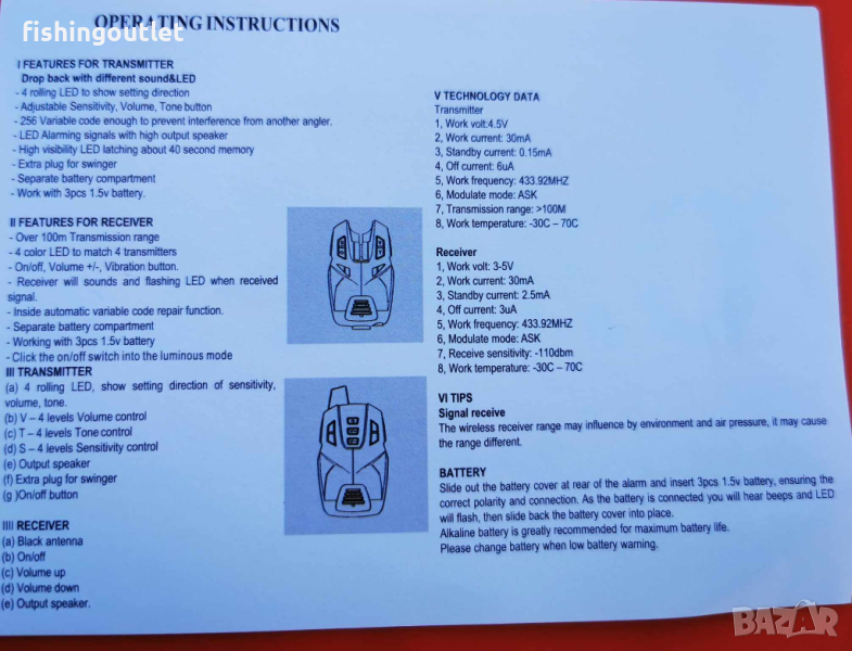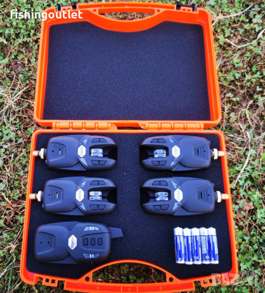 Стилен и висококачествен комплект сигнализатори с централа, които се съхраняват в удобен и лесен за транспортиране куфар. Сигнализаторите са със звукова и светлинна сигнализация, контрол силата на звука, както и на чусвтителността и букса за включване на обтегач с диод, работят с батерии AAA( включени). Централата има възможност за връзка с 4 сигнални устройства работи с 3 броя алкални AAA батерии ( включени). Имат здрав, водоустойчив пластмасов корпус . Разполагат с четири вида светлинна сигнализация . Сигналът е уловим от станцията на разстояние над 100мт