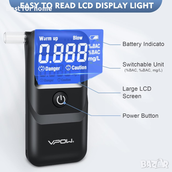 Алкотестер за тестване на алкохол, тестер за алкохол VPOW с цифров син LCD дисплей, клас