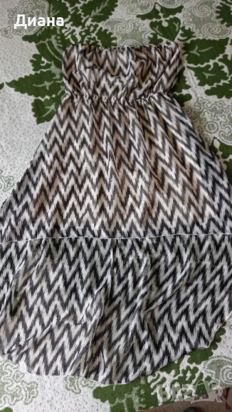 Лека лятна маркова рокля шифон с подплата, няма прозрачност, без презрамки, топ качество. Моделът е силно асиметричен, ефирен, стои превъзходно. Подмишници на ластик от 41 до 54см едностранно, талия на ластик от 36 до 52см едностранно, дълж.отпред 77, отзад 114см.