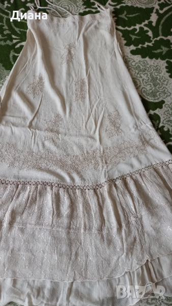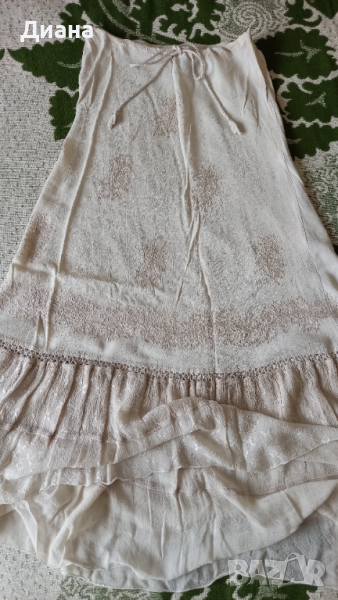Страхотна рокля вискоза, в цвят капучино, с богати апликации от ръчна бродерия с копринен конец и волани дантела, както отпред, така и отзад. Без презрамки, има ластик на гърба и връзка отпред за регулиране на ширината според бюста. Удивително добре стои и като дълга пола - зависи от ръста. ГО 40 до 50см едностранно, Х 60см едностранно, дълж.96см.