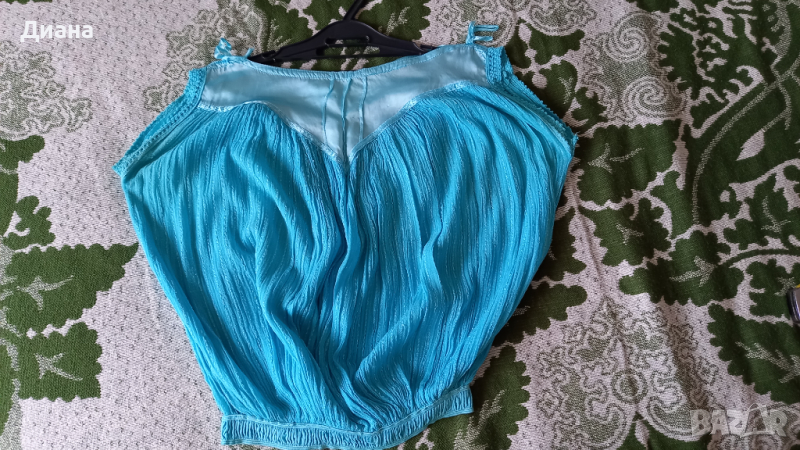 Страхотна лятна блузка памук/кенар в наситено небесносиньо, купувана от Гърция, обличана веднъж. Има богат набор, сатенена платка на деколтето и ластик долу. ГО до 72см едностранно, шир.долу 35 до 72см едностранно, дълж.60см. Цветът е по-светъл от снимките.