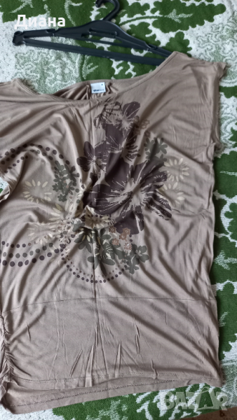 Туника памучно трико с красива апликация, цвят млечен шоколад, може да се носи и с паднало рамо, има плоха на гърба. ГО 60, Х 48-55см едностранно, дълж.отпред 65, отзад 73см.