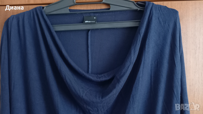 Много тъмносиня тънка и фина туника, прав силует, гръцко деколте, има разтегливост. ГО 50 до 65см едностранно, дълж.85см. Цветът е по-реален на втората снимка.