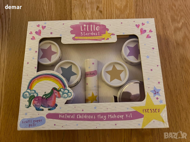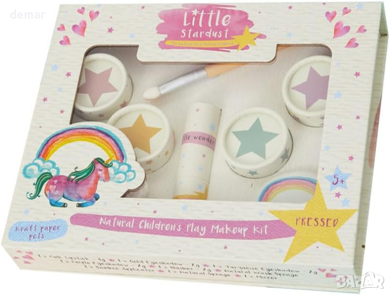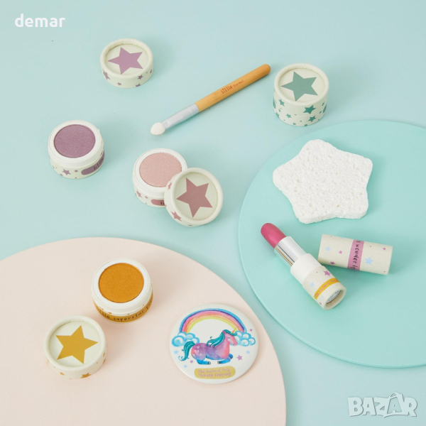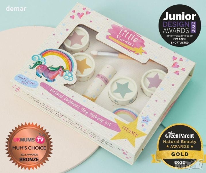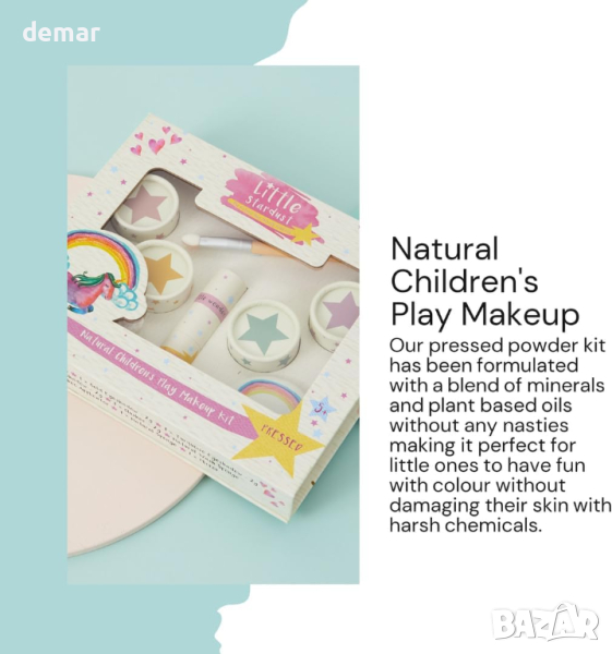Този нетоксичен детски комплект гримове, изработен от смес от растителни масла и естествени минерали, е награден продукт от първата компания за грим Natural Play в Обединеното кралство. Компактната подаръчна кутия с размери 20 x 16,5 x 3,5 cm е пълна с подходяща за деца козметика, включително 4 сенки за очи/руж, дискретно естествено червило, гъба за измиване, бамбуков апликатор и малко огледалце. Създаден за творчество, гримът може да се трансформира в искряща боя за лице само с вода или алое вера и лесно се измива с вода, което го прави идеален подарък за деца.