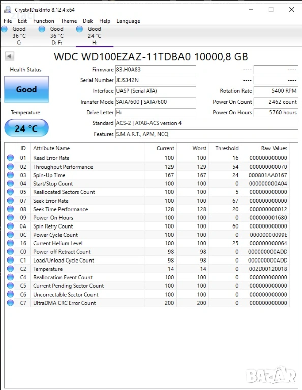 WD WD100EZAZ-11TDBA0 10TB 5400 RPM подходящ за NAS sata hdd hard disk хард диск малко ползван → Обява 44583635