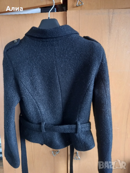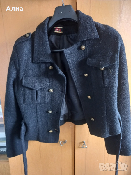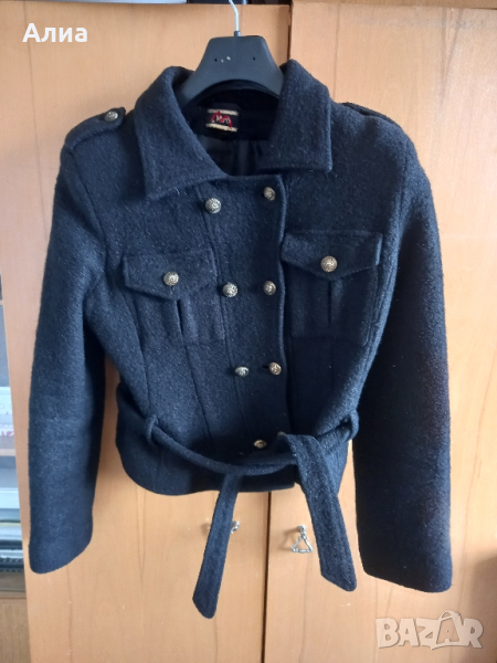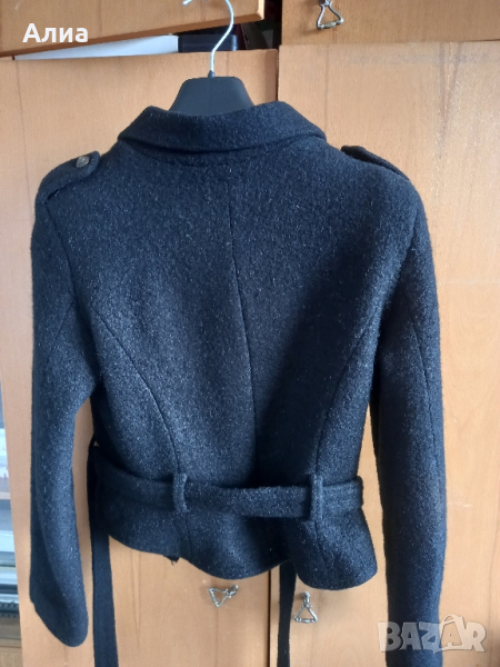 Черно, късо, дамско сако/яке/ палтенце. Двуредни копчета с колан. Много е интересно и стои много добре, и спортно и елетантно, и за връхно става. Естествена материя. Носено е много малко, бързо ми стана малко. Номер 44. Здраво и запазена форма.
