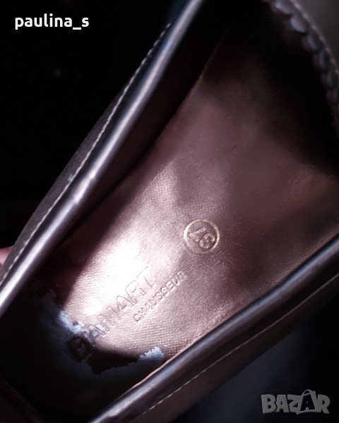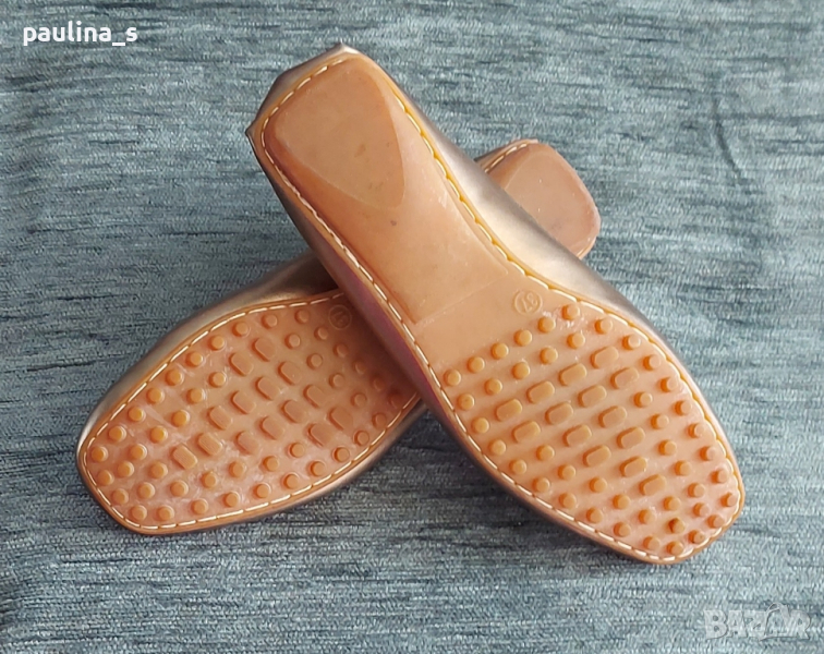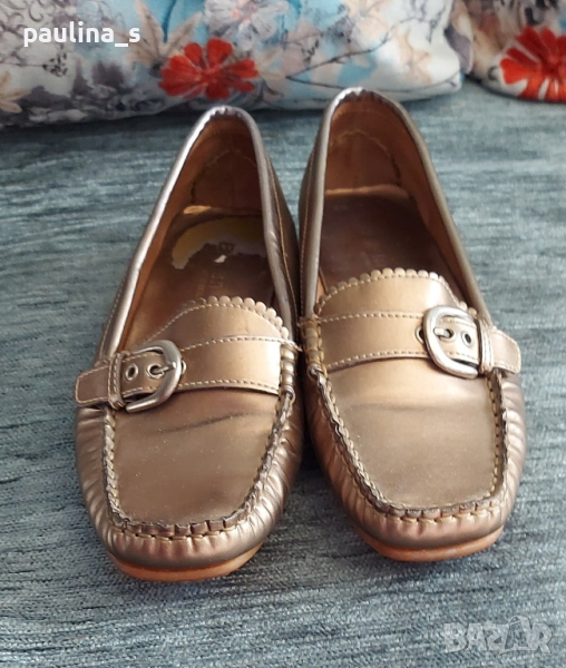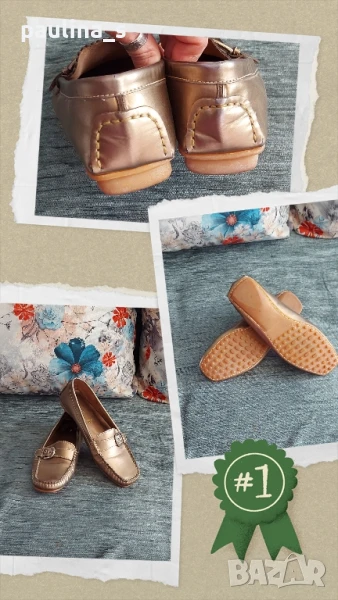 1️⃣. "Damart" chauseur. N 37. Цената е крайна 29,99лв. Тарикатски ортопедични мокасини в опушено златисто. Подметката е от каучук, не много еластична и стабилизираща ходилото. Кожата е много качествена артифициална, мека и еластична, в много добро състояние, следи от употреба има само във вътрешността. Стелка 24,5см, много удобни и ефектни.