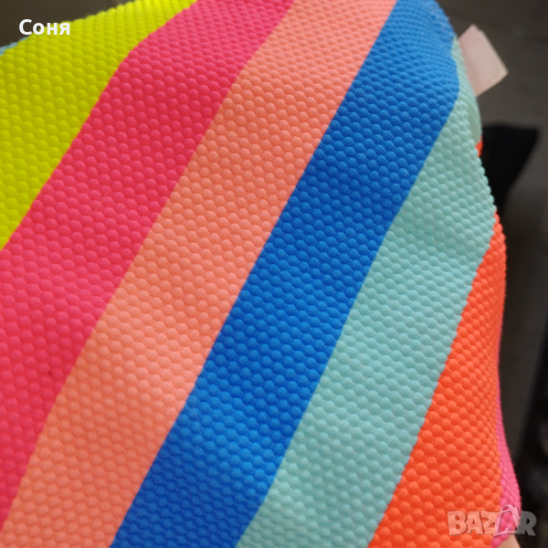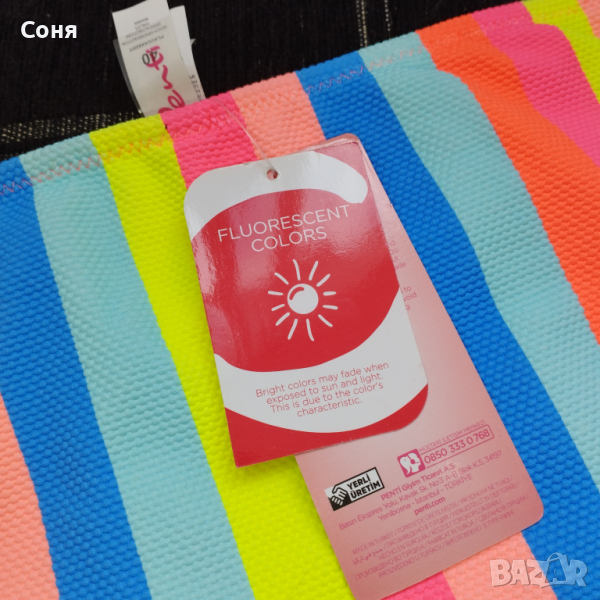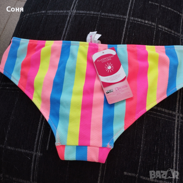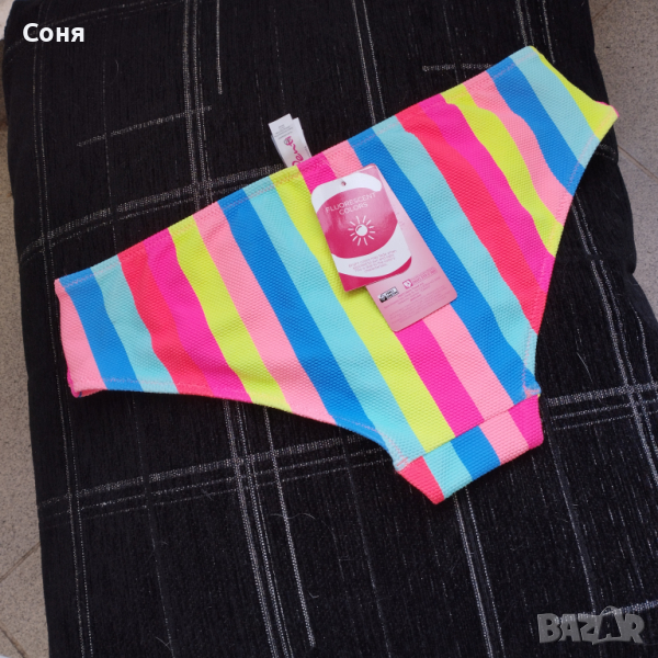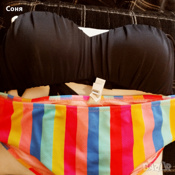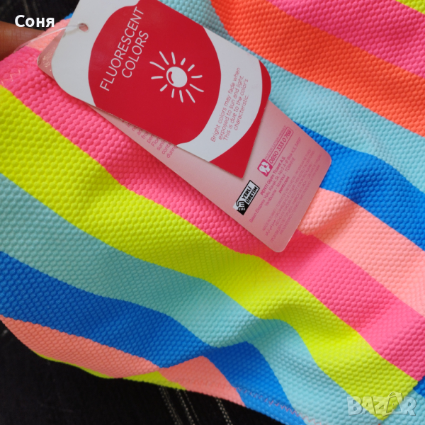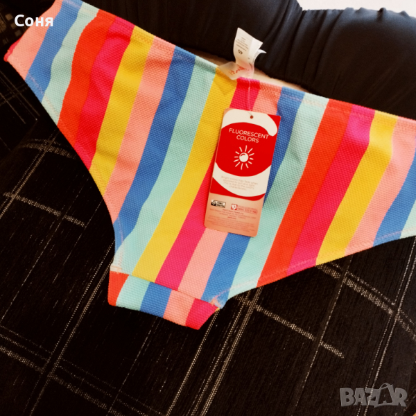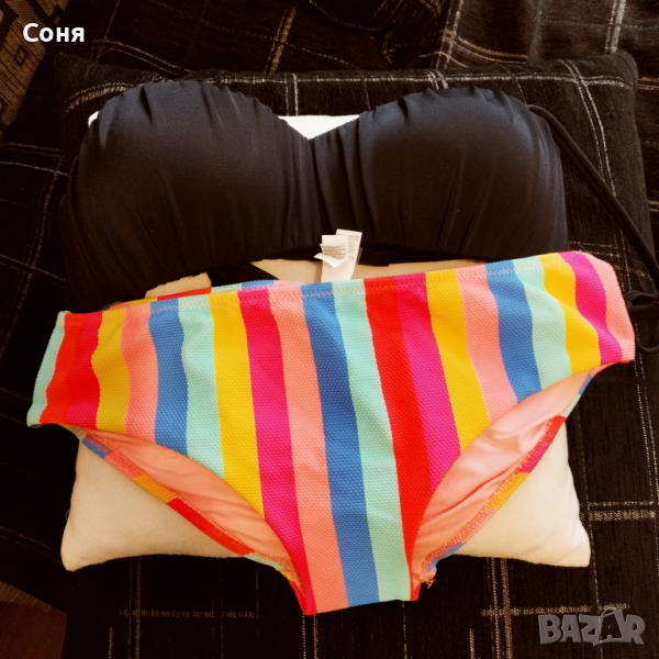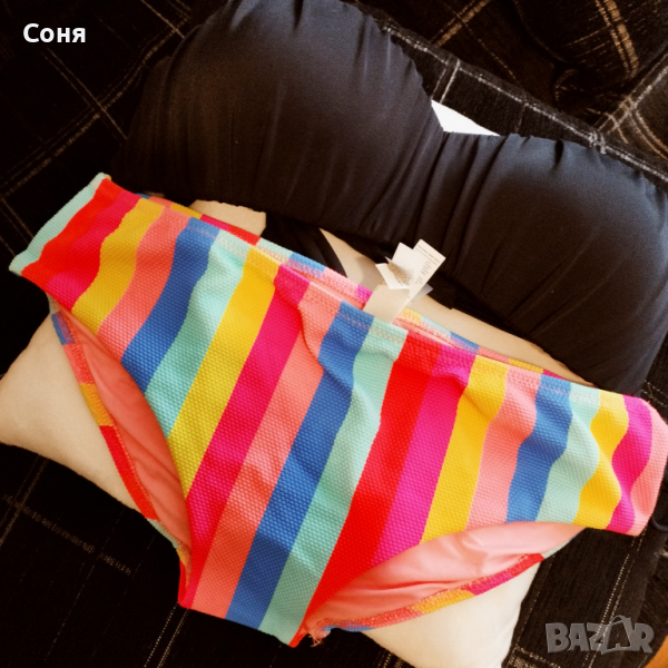 Бански костюм от две части размер M-L, нов, с етикет. Горнището е в натурално черно с пришита отдолна страна тънка подплънка за добра визия на банския, регулира се с презрамки които се връзват на врата и на гърба отзад. Долнището е многоцветно в супер електрикови - флуоресцентни цветове, които изключително добре се допълват с летния загар на кожата, за жалост телефона не може да ги хване в реалният им цвят, в действителност са още по наситени, електрикови. Материята е много мека и приятна на допир със високо съдържание на ликра което го прави доста еластичен за добро прилягане към тялото. Бански с който няма да останете незабелязани на плажа.