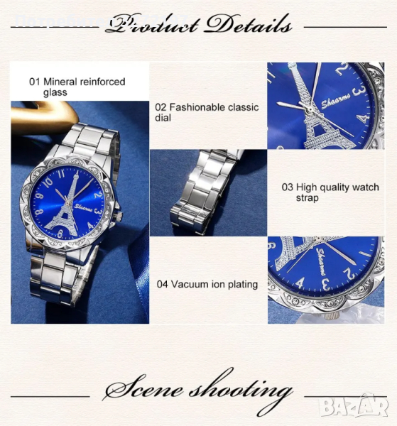 • Дизайн на циферблата на Айфеловата кула: Уникалният дизайн на циферблата на Айфеловата кула на този дамски кварцов часовник добавя нотка елегантност и изтънченост към вашето облекло.
