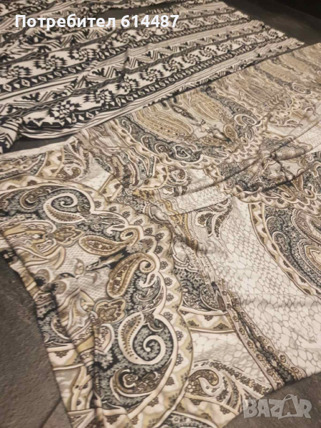 Сет от два силно еластични сатенени панталони със съдържание на голяма ликра. Висока талия , цветен десен и отговарят на М/Л . Ако дамата предпочита да са още по -еластични стават и за хл размер. Цената включва и двата панталона, състоянието им е безупречно.
