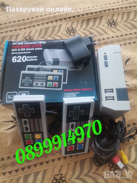 Ретро телевизионна геймърска конзола с 620 вградени игриЛюбимите на всички класически игри се завръщат в игровата конзола.Подходяща за всички подрастващи геймъри, подрастващи и вече порастнали. С нея ще се забавлявате истински! Свързва се изключително лесно - просто поставете кабели от комплекта към играта и към телевизора. В играта ще намерите 620 броя вградени игри като супер марио, контра, чип и дейл, колички и много други.Предимства, преимущества и характеристики:Списък с инсталирани игри:SUPER MARIO BROSSUPER MARIO BROS 3DR MARIOMARIO BROS & WRECKING CREW(ORIGINAL ARCADE GAMES)DONKEY KONG 1, 2, 3 & Junior MathNINJA TURTLES 1 & 3KAGE(SHADOW OF THE NINJA)ADVENTURE ISLAND 1, 2, 3 & 4LITTLE SAMSONEXCITE BIKECHIP AND DALE 2CONTRACONTRA FORCESUPER CONTRASPIDERMAN 2 & 3BOMBERMANELEVATOR ACTIONPAPER BOYHOME ALONEMEGAMAN 3ROBOCOP 2GRADIUSGALAGA1942ALADDIN 3SPACE INVADERSKAGE(SHADOW OF THE NINJA)NINJA GAIDEN 1 & 2POWERBLADE 1 & 2THE LEGEND OF KAGEKUNG FUHOTBLOOD SERIES(PREVIOUSLY UNAVAILABLE IN EUROPE)ICE HOCKEYBUBBLE BOBBLE 2PAC MAN 1 & 3PAC MANIAMS PAC MANPAC LANDXEVIOUSCHUBBY CHERUBFLAPPYTETRIS 1 & 2LODE RUNNERKLAXADVENTURES OF LOLO 1 & 2ARKANOIDFRIDAY THE 13THPLANTS Vs ZOMBIESSOLOMON’S KEYSPY Vs SPYPOPEYE-Видео игри, които Ви връщат към спомените от детството-Над 620 ретро 8-битови видео игри-Входящо напрежение: 110-240 V 50/60 Hz-Изходящо напрежение: DC 5 V/500 mA-Размери на конзолата: 125×98×42mm-Размери на джойстика: 121×52×16mm-Легендарен дизайн-Материал: ABS-Тегло: 425 гр-Включен RCA кабел за свързване на джойстиците-Включен 3 чинчов AV кабел за връзка с телевизора