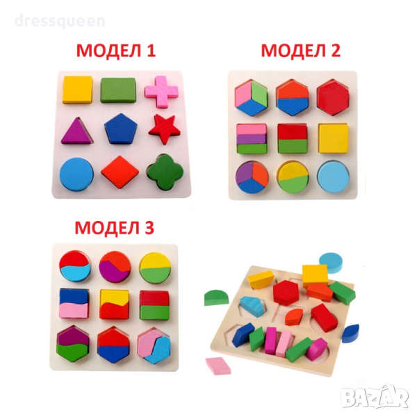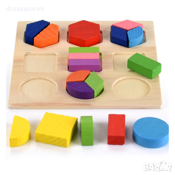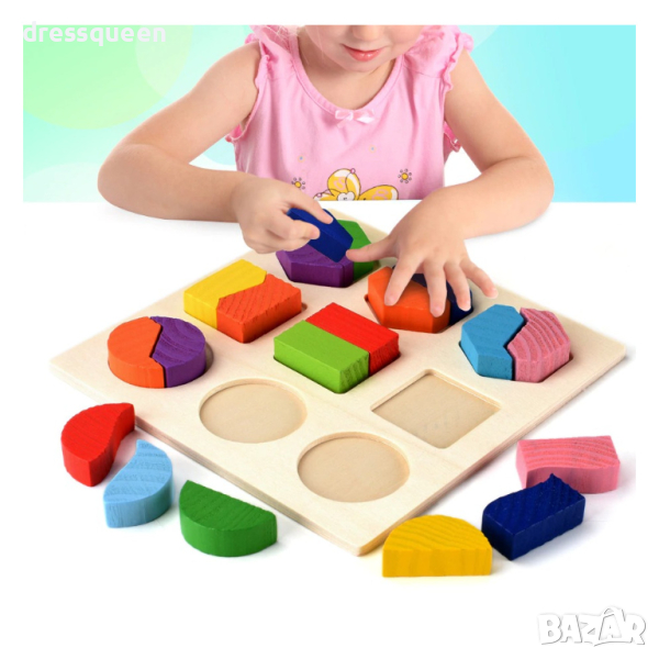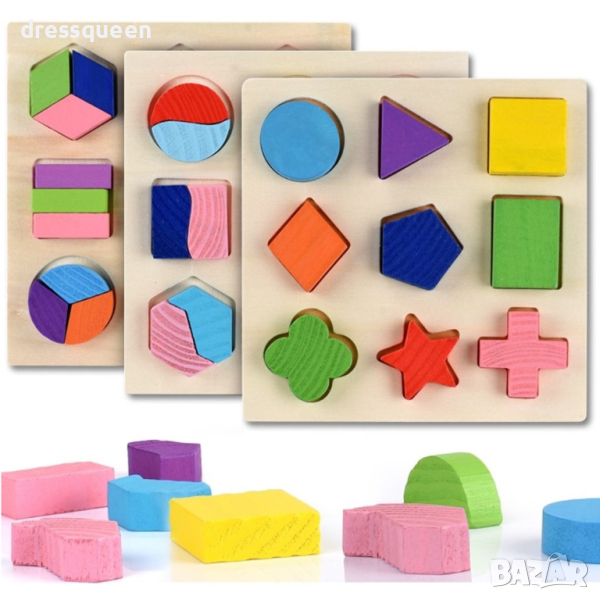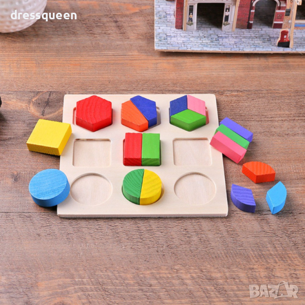 3588 Детски дървен пъзел 3Д с образователна цел и дъска с геометрични фигури → Обява 44597899