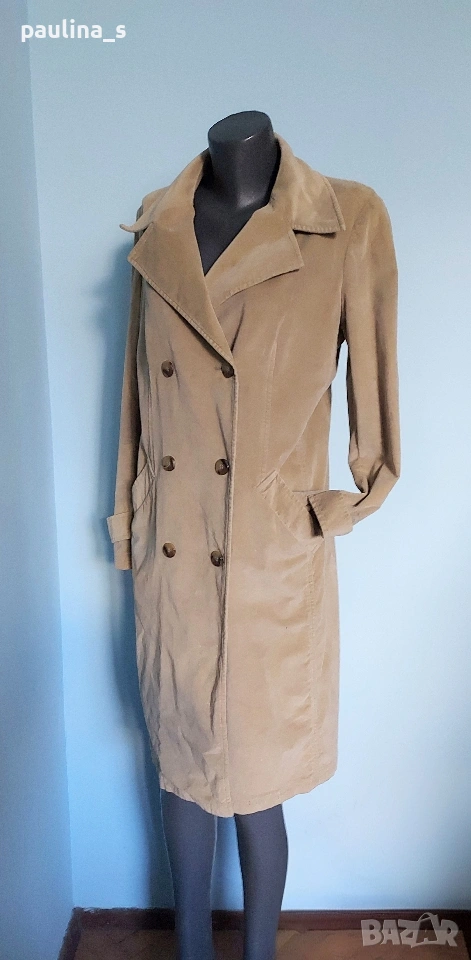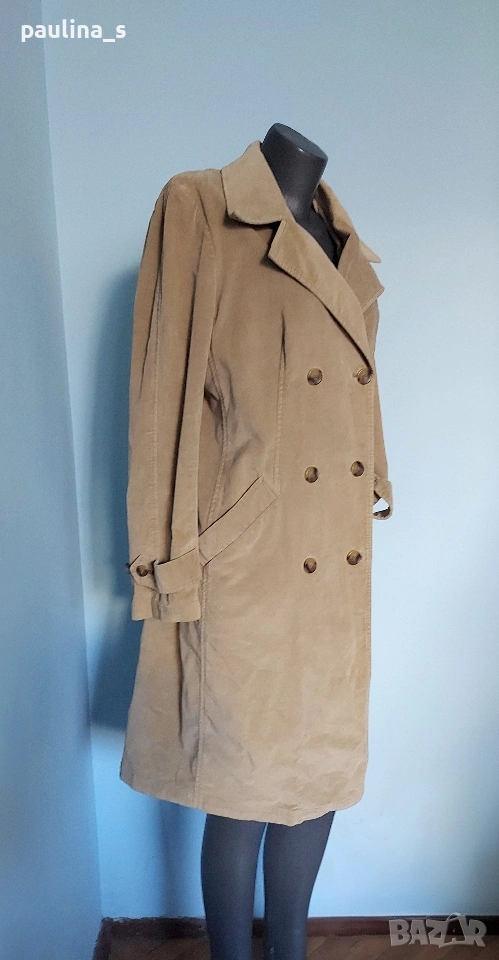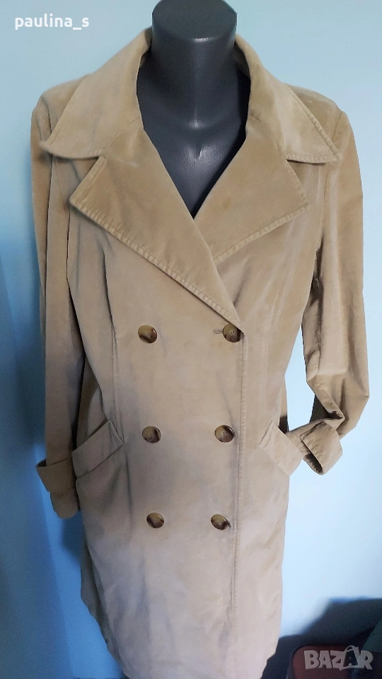 2️⃣. L / 2XL - Кадифено манто Three hearts❤️❤️❤️" by Marks & Spencer. Цената е крайна, без пазарлъци 25 евро. Дамско еластично манто тип тренч, класически модел кардиган. Материята е еластично кадифе / плюш - памук и ликра. Закопчаването е двуредно и винаги актуално, джобовете са разположени косо отпред, стои много елегантно, поради еластичността на плата, което прави дрехата неповторима. Превъзходно изработена, без хастар, но с осигурителни ленти, една бройка, без дефекти, като ново.