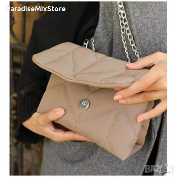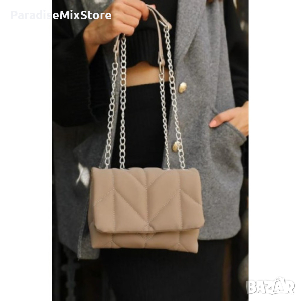 Дамска ватирана чанта в бежов цвят с клъч затваряне и дълга дръжк тип синджир → Обява 44601884
