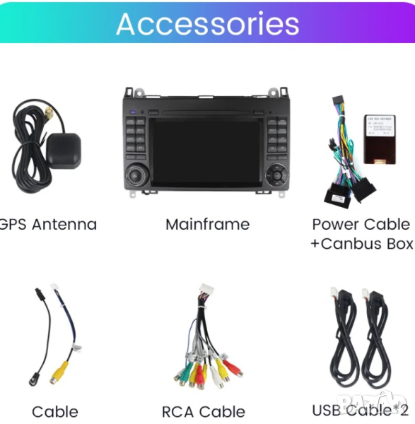 Пълен комплект с цялата рамка, преходни кабели и букси, декодери, предназначени и съвместими за монтиране на конкретния модел автомобил.