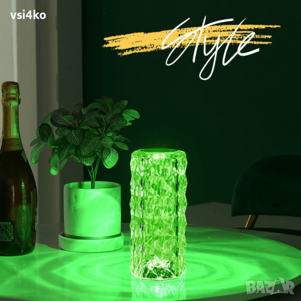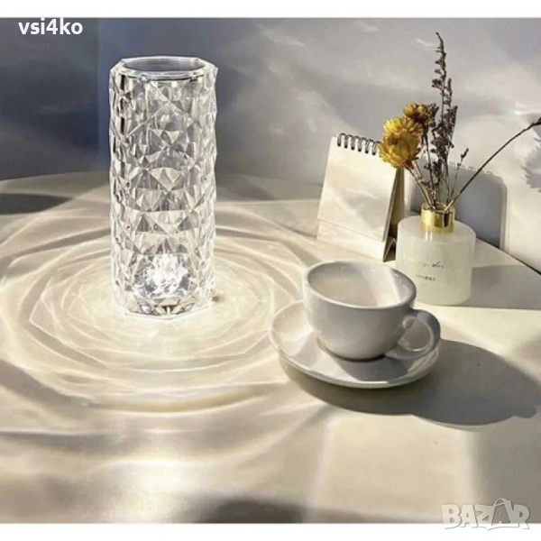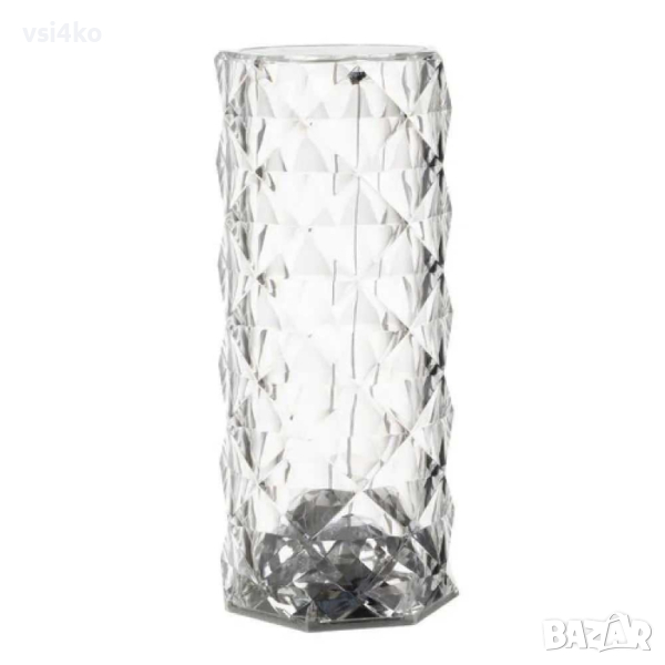 LED кристална настолна лампа – проектор с шарки на рози, когато е включена – Удивителният ефект на тази лампа е, че когато свети, върху равна повърхност се появява шарка на рози. Този модел прави особено впечатление върху голяма повърхност, напр. поставени на маса или под.