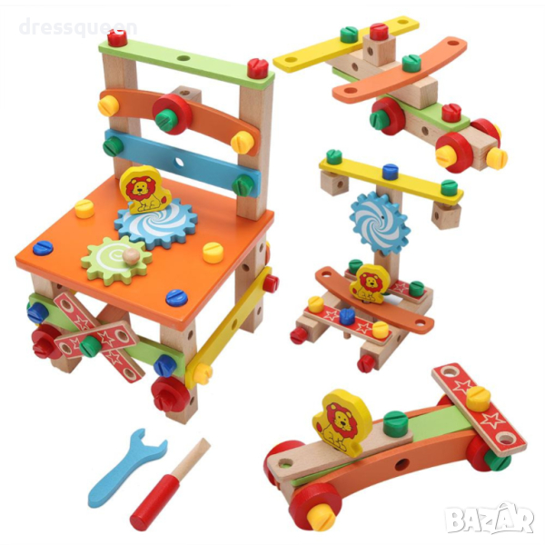 Всички части са изработени от висококачествено дърво, което е тествано за деца, а размерът е предназначен и за деца, дори инструментът за болтове и гайки е здрав и подходящ за деца.