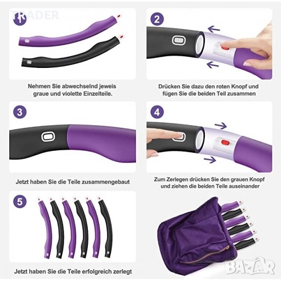 - Има различни настройки за различните хора: потребителите могат да регулират обръча към желаната форма и възраст на тялото си благодарение на осемте подвижни секции за хула обръч. 6 секции по 73 см всяка: подходящи за деца. 7 секции по 84 см всяка: подходящи за хора до 50 кг. 8 секции по 95 см всяка: подходящи за хора над 50 кг. Съвет: времето за тренировка не трябва да надвишава 15 минути, за да избегнете мускулна болка поради пренапрежение.