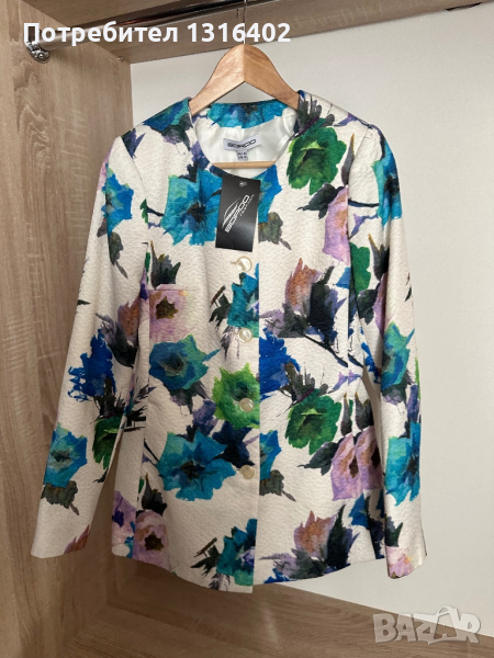 Ново пролетно сако “Bordo”, размер S, има подплънки на раменете, материя полиестер и вискоза, ширина под мишници 44см, талия 40см, ханш 48см, рамене 38см, дължина 70см, ръкав 65см.