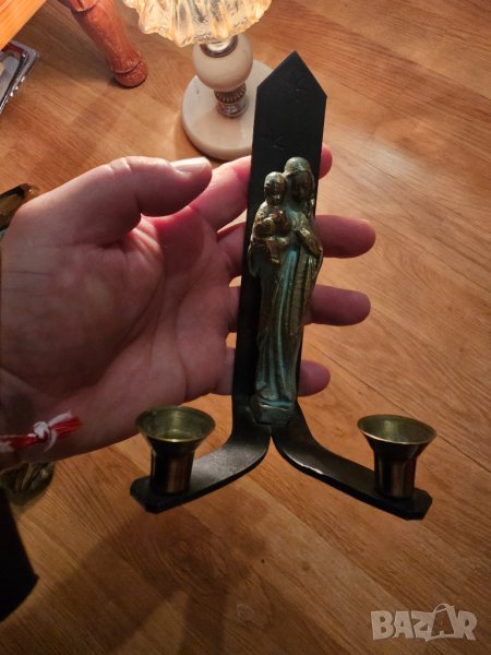 Старинен бронзов свещник с дева Мария бородица с младенеца.