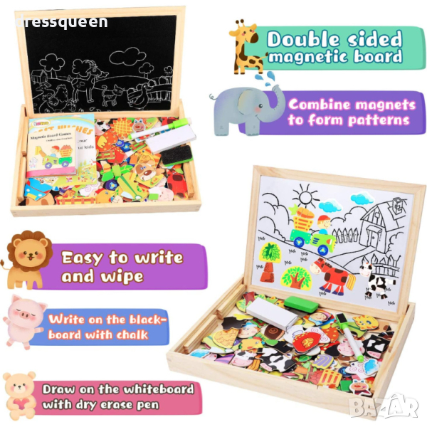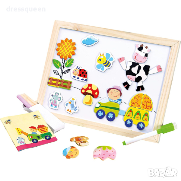 ✅ Дъската е двулицева, магнитна от едната страна, тебешир от другата, което дава още повече възможности за игра и учене. Комплектът включва цветни магнити и тебешир, както и гумичка и цветна книжка с примерни пъзели.