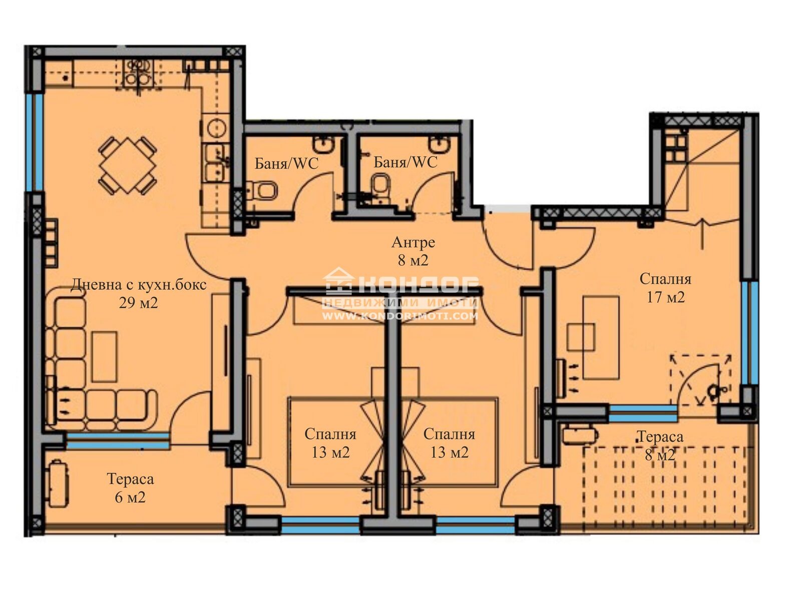 Оферта 63824: Представяме Ви новоизградена малка и луксозна сграда ПРЕД АКТ 15 от типа на Фамилна къща, проектирана така, че да създаде максимален комфорт и уют. Сградата се намира на тихо и спокойно място в близост до всички необходими комуникации с отличен и лесен достъп към централната част на града. Жилището се състои от дневна 29кв.м. с трапезария и кухненски бокс с излаз на тераса, три самостоятелни спални: две детски по 13кв.м. и една родителска 17кв.м., баня с тоалетна, втора тоалетна, тераса и входно антре. Обектът се строи от фирма с доказан опит, като разполагаме с готови сгради и можем да Ви покажем качеството на изпълнение, което се осъществява с висококачествени материали и съвременни технологии, по европейски стандарт, петкамерна PVC дограма, червена Австрийска Тухла, масивна Блиндирана входна врата с 4-странно заключване, сензорно осветление, хидравлични асансьори с огледална кабина. Свободни подземни Гаражи и паркоместа !! ЧУДЕСНА ИНВЕСТИЦИЯ!!! Възползвайте се от възможността да живеете в малка бутикова сграда!!!