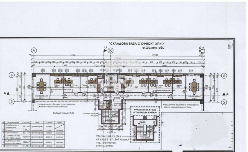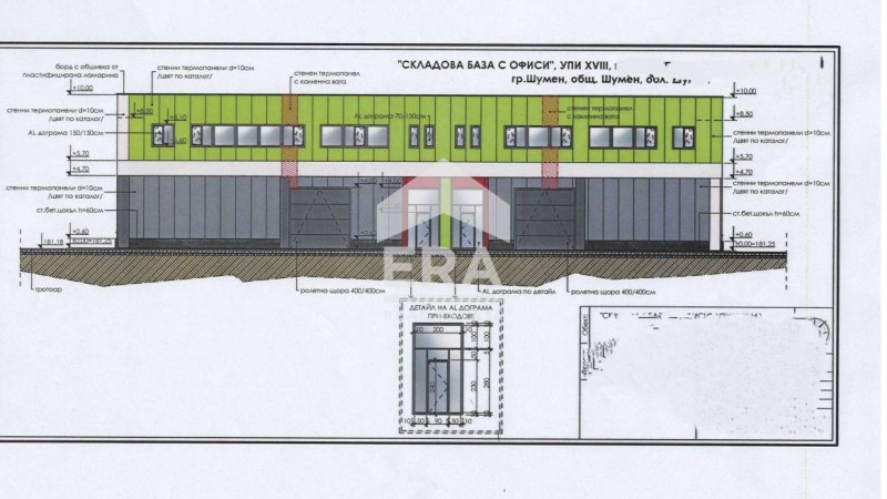 ЕРА 1300 отдава под наем СКЛАДОВА БАЗА С ОФИСИ. Обекта се състои от два отделни склада с офиси към тях. Двата офиса са с по три работни помещения и по една заседателна зала. Към всеки от офисите са изградени съблекалня със санитарен възел и душ към тях. Височината на офисната част е 2.60м. Складовата база е изградена като сглобяема стоманобетонна конструкция по конструктивен проект. Височината на складовата площ е 8.50м. Настилката е от шлайфан бетон - В37/кубична якост/. Отдолу има трамбовани насипи от пясък, чакъл, армировка и бентон.Външните ограждащи стени и вътрешната преграда са от термопанели с d=10см. Покривната конструкция се изпълнява от стоманобетонни панели. Обслужващите врати са алуминиеви ролетни щори с размери 400/400 см. Базата разполага със собствен паркинг от осем паркоместа, като едно от тях е за инвалиди. Складовата база е на етап акт 14, очаква се въвеждане в експлоатация 05.2024г. Подходяща е както за производство, така и за складова дейност.
