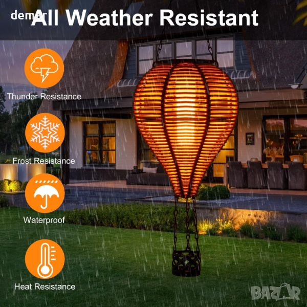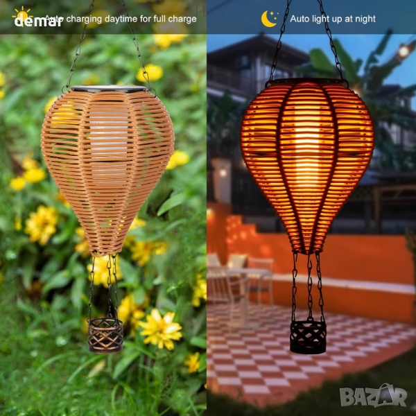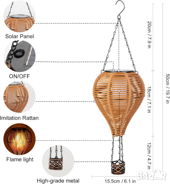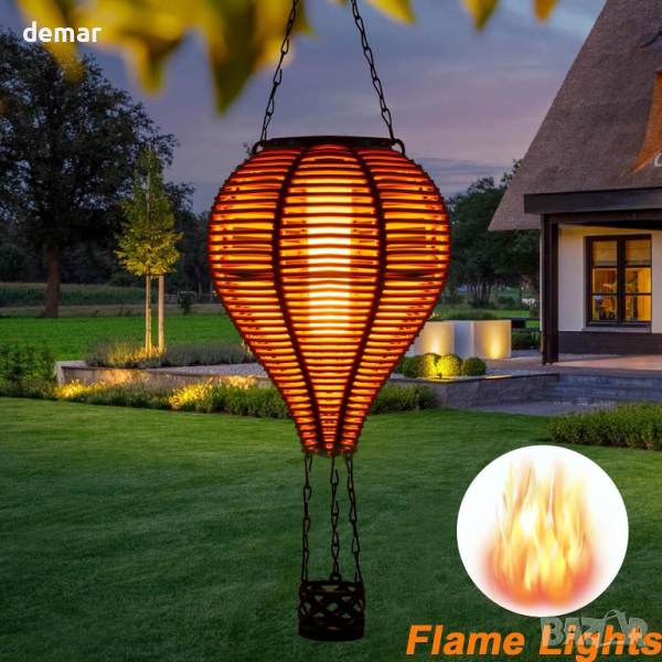 Подобрете атмосферата си на открито с този очарователен висящ соларен фенер, проектиран да прилича на балон с горещ въздух, допълнен с реалистични пламъци. С настъпването на здрача той хвърля топла и успокояваща светлина във вашата градина, вътрешен двор, двор или дори в детска стая, което го прави прекрасно допълнение към вашата коледна украса. Захранван от слънчева енергия, този фенер е екологичен, автоматично светва при здрач благодарение на вградения сензор и поликристалните слънчеви панели. Изработен от издръжлив материал от имитация на