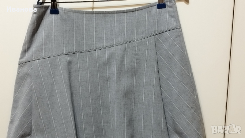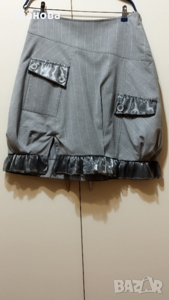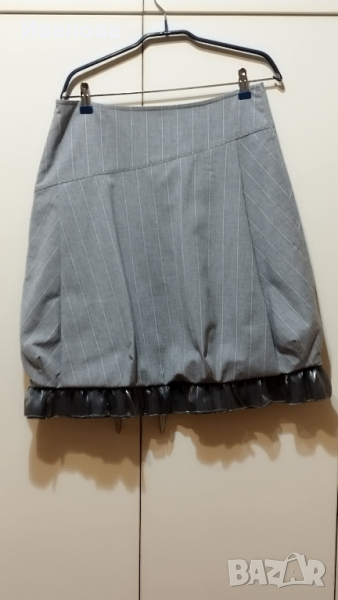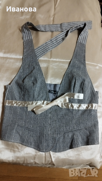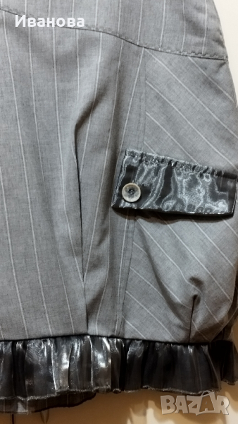 Елегантна пола и елек в светло сиво на бели финни райета. Полата е с подплата . Красиви апликации от сив тюл по джобовете и края на полата . Интересна кройка с басти в долната част . Размер М , талия 81 см , ханш 106 см , дължина 54 см. 100% памук . Елекът е тип бюстие. Също е с подплата и се връзва на вратът.