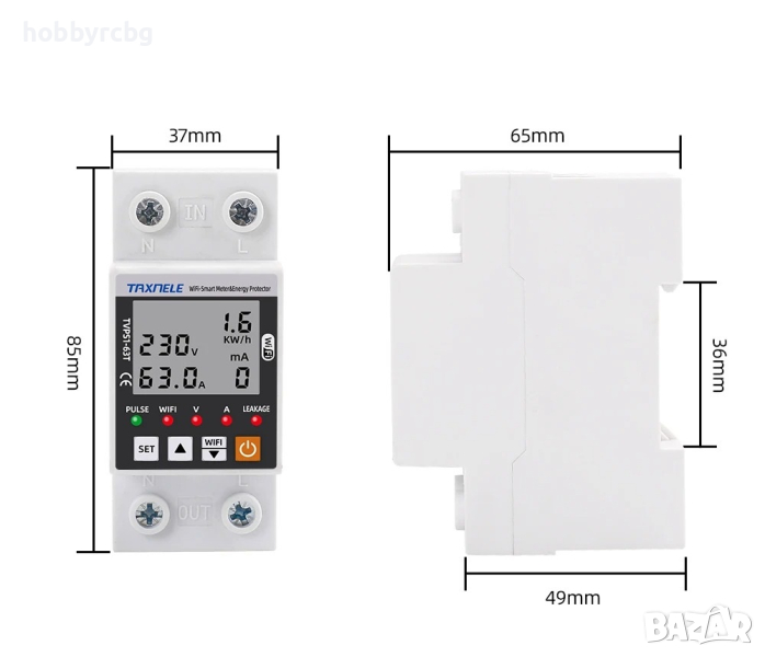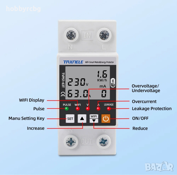 електромер със защити от ниско и високо напрежение, претоварване, защита срещу изтичане, защита при земетресение. Можете да наблюдавате през всяко едно време на LCD дисплей, напрежение, ток и мощност. WIFI връзка с всички популярни смарт приложения: Tuya Smart, Smart Life, Google Assistant, Amazon Alexa, Алисой. Наблюдение от телефон на всички измервани параметри.