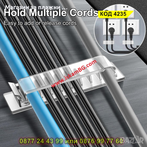 Щипка органайзер за кабели с 8 канала - самозалепваща се - 1 брой, ПРОЗРАЧЕН - КОД 4233