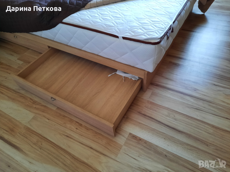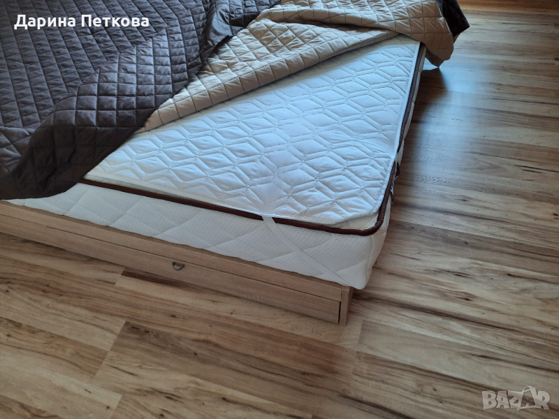 Продавам чисто нова спалня, заедно с матрака - размер - 140х200. Спалнята има предпазна дъска, на която са закрепени 2 чекмедженца, които служат за нощно шкафче, а под матрака е с 4 бр. големи чекмеджета, които са много по-удобни отколкото с механизъм за повдигане на тежкия матрак.
