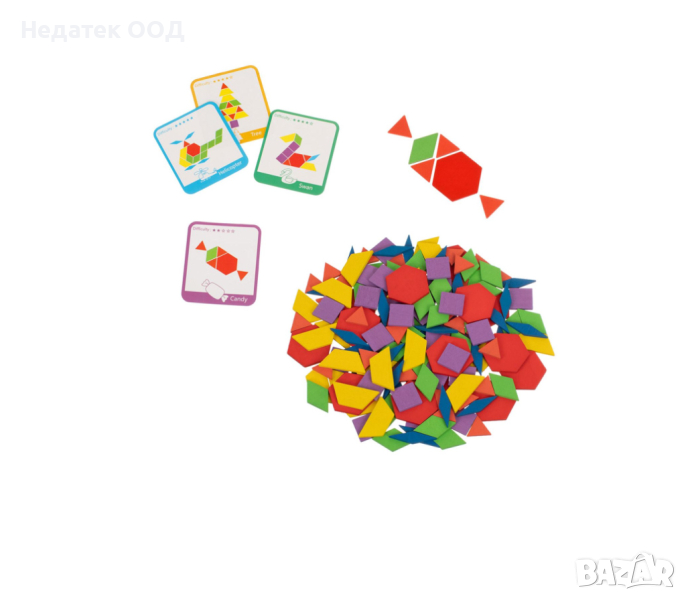 Дървен цветен танграм. Съдържа карти с форми и дървени плоски части в различни дизайни и цветове. Целта е да направите същата форма на картата, като използвате правилните части. Помогнете на детето си с тези блокчета в различни форми и цветове, за да развие своето търпение и възприятие. Това е идеална играчка, която насърчава въображението, интелектуалното развитие и координацията на усещането за допир и зрението на детето чрез разпознаване на цветове и модели.