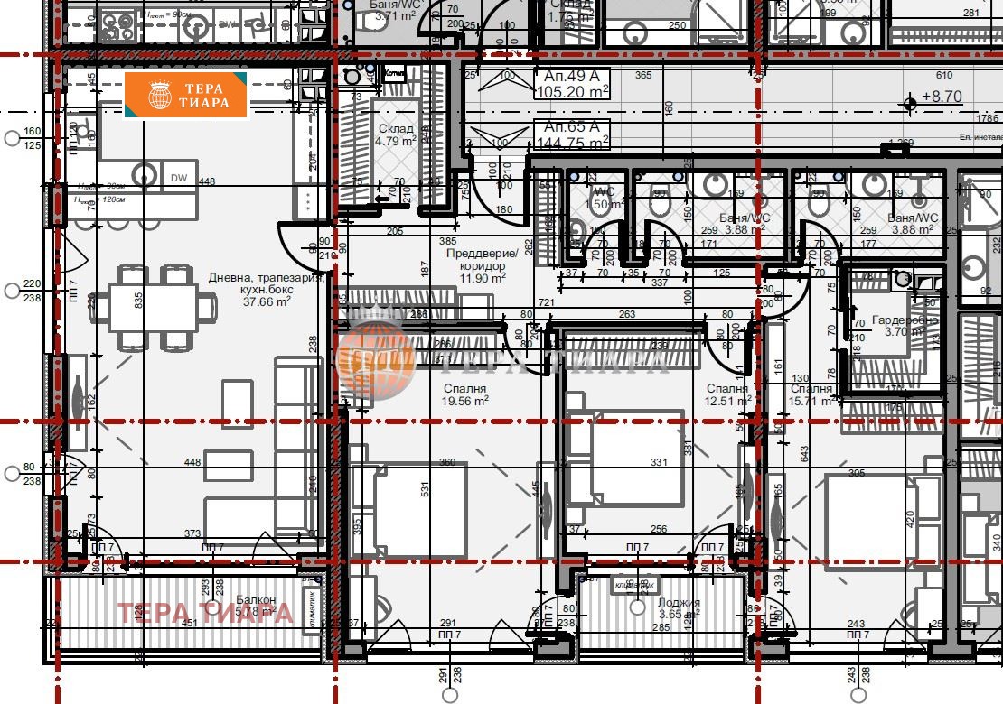 Агенция ТЕРА ТИАРА продава БЕЗ КОМИСИОННО ЧЕТИРИСТАЕН апартамент в новостроящата се сграда, разположена в полите на Витоша в ж.к. Младост 4. Жилището се намира на 3 етаж от 10 и е с функционално вътрешно разпределение на площ от 168,17 кв.м. (застроена площ 144,75 кв.м. + 23,42 кв.м. общи части) и се състои от Дневна с кухня и трапезария ( 37,66 кв.м.), Спалня ( 15,71 кв.м.) с Гардеробна ( 3,70 кв.м.)и собствена Баня с тоалетна( 3,88 кв.м.), Втора Спалня ( 19,56 кв.м.), Трета Спалня ( 12,51 кв.м.), втора Баня с тоалетна ( 3,88 кв.м.), отделна Тоалетна, Дрешник / Склад, Преддверие и два Балкон. Изложение: Юг. Отопление: ГАЗ. За удобството и комфорта на бъдещите собственици, в сградата има възможност за покупка на единични и двойни подземни и надземни гаражи и паркоместа, на цени от 18500 евро до 36000 евро, осигурено е видеонаблюдение и контрол на достъпа. Очакван Акт 16 началото на 2027 годината.