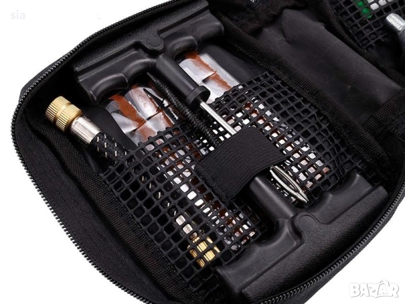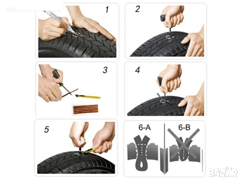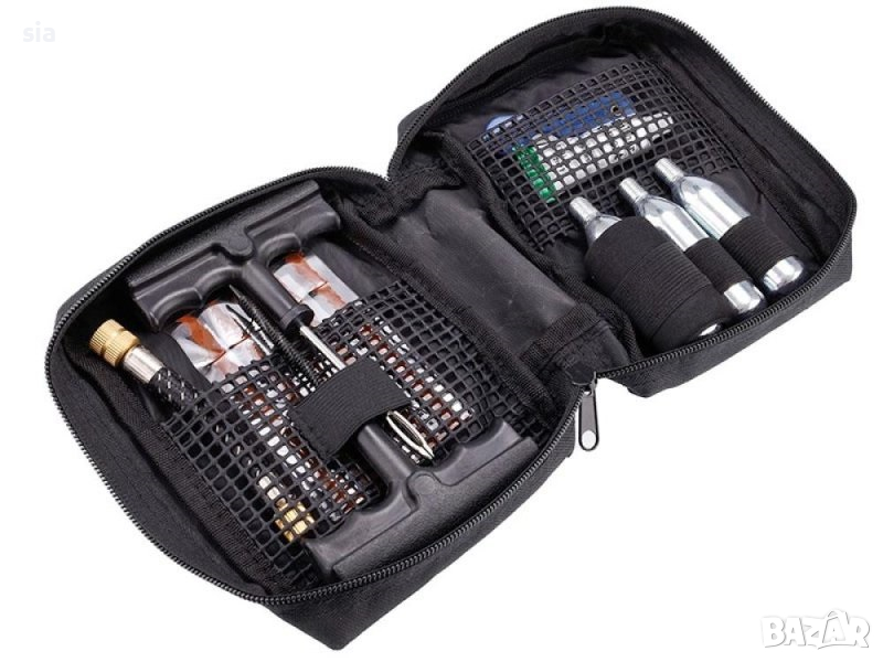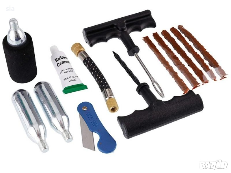 Комплектът включва:2бр инструмент за ремонт (100 mm) ,5 броя фитил,лепило осигуряващо приплъзване по време на нанасяне и по-бърза вулканизация на фитила с гумата (12 ml) ,CO2 патрон (16 g) - 3 броя за напомпване ,маркуч за CO2 патрони (10 cm) ,резец .Комплектът е предназначен и за гуми за мотоциклети и скутери.Важно! Комплектът е за временен ремонт.Намира приложение при аварийно залепване на спукане гума.Съвместим с всички видове гуми на леки, лекотоварни превозни средства без вътрешна гума.Ъгъл за монтиране на фитила : 90°Дължина на фитила в милиметри : 9053943