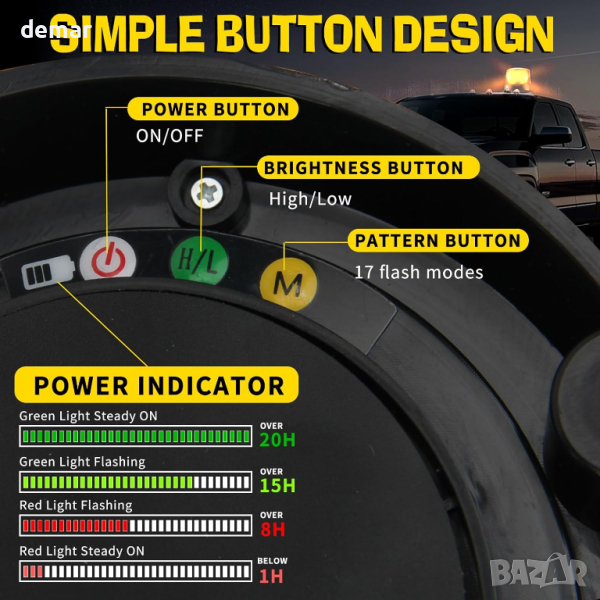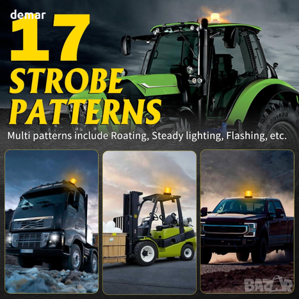 Кехлибарена мигаща светлина с 24 LED чипа с висок интензитет за 360-градусово супер ярко покритие, идеална за подобряване на видимостта при спешни случаи, пътна помощ или строителни работи. С кристално прозрачен корпус за максимална яркост, той остава видим ден и нощ. Акумулаторният дизайн предлага гъвкавост както с автомобилни, така и с домакински зарядни устройства, като показва ниска батерия с червена светлина. Предлагайки 17 светлинни модела, включително въртящи се, постоянно светещи и мигащи, той също така осигурява регулируеми нива на яркост и функция за памет за последния използван модел. Силната му засмукваща магнитна стойка осигурява лесно и сигурно закрепване към всеки метален покрив, което го прави идеален за широка гама превозни средства от SUV до снегорини. От съществено значение за професионалисти в областта на правоприлагането, теглене, сигурност, строителство и реагиране при извънредни ситуации.