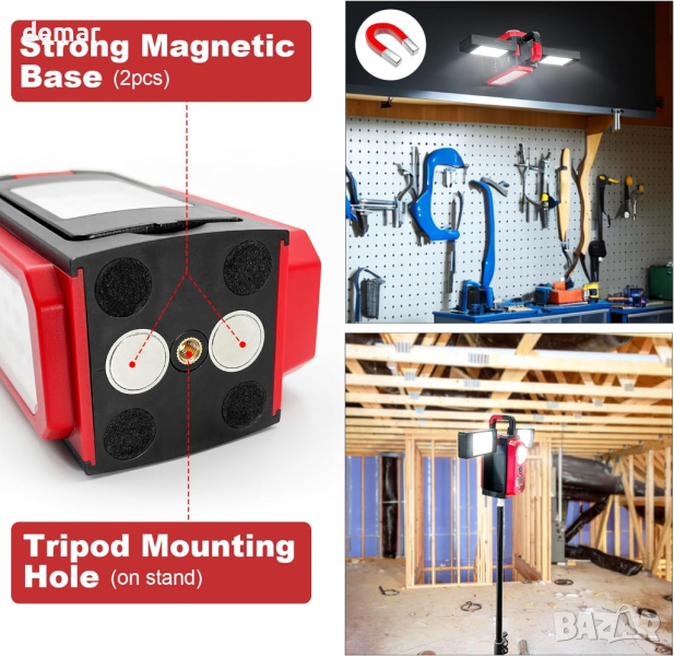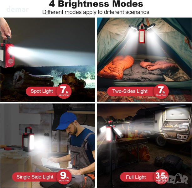 Акумулаторната работна лампа предлага разнообразно осветление с два регулируеми прожектора, които се въртят на 180° нагоре и надолу и на 270° настрани, допълнени от 4 режима на осветяване, включително мощно фенерче. Излъчвайки 3000 лумена с 58 бели светодиода с висок лумен и един светодиод CREE P50, той осигурява изключителна яркост за всяко работно пространство, с до 9 часа работа благодарение на своята акумулаторна литиева батерия от 4400 mAh. Дизайнът му с кука и магнит позволява работа без ръце и сигурно закрепване към различни повърхности, докато първокласната ABS конструкция гарантира издръжливост и IPX5 водоустойчивост за надеждна работа на закрито и на открито. Освен това той функционира като захранваща банка за аварийно зареждане на устройства, което го прави основен инструмент за работа или ежедневни задачи.