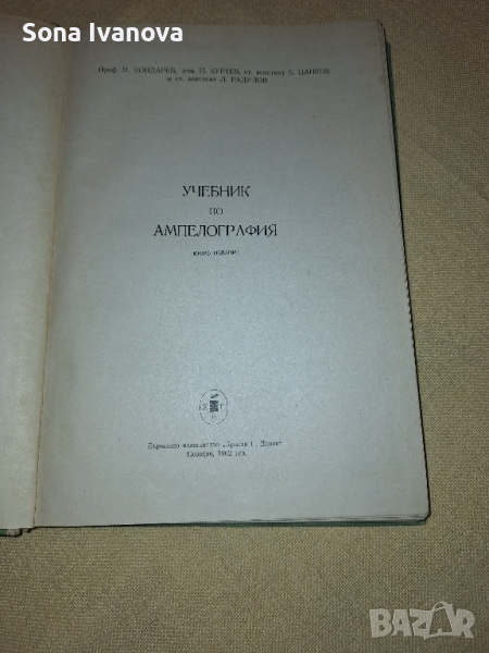 Ампелография, авторски колектив: Кондарев, Куртев, Цанов, Радулов, учебник второ издание. 1962 г, издателство Христо Г. Данов. Твърда подвързия, формат В5, 272 стр. Добро състояние, предвид времето. Подписана от предишния собственик, подчертаване с молив на отделни пасажи.