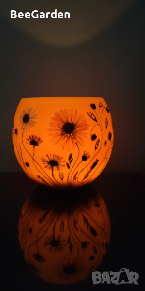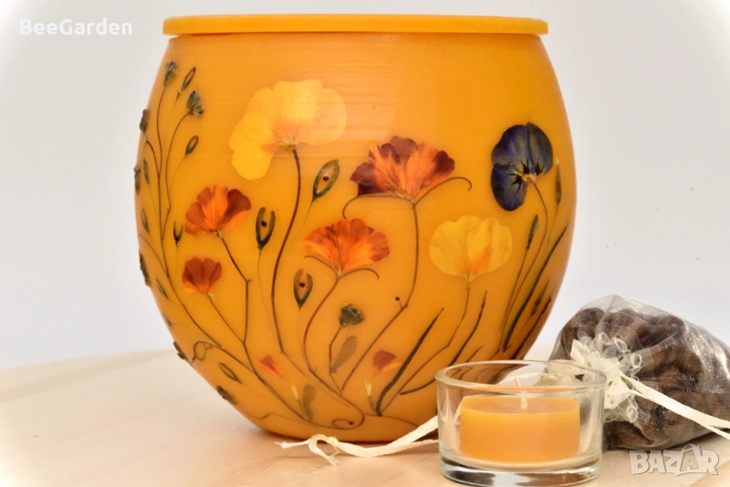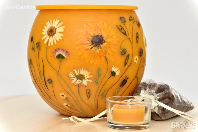 пчелен восък и ръчно декорирани с градински и полски пресовани цветя, фенерите са страхотно допълнение към всеки повод и се вписват прекрасно в пространството на закрито или на открито. Просто поставете запалена чаена свещ вътре, за да създадете прекрасна златисто-оранжева светлина. Красивият блясък и мекият меден аромат имат способността да обединяват хората.