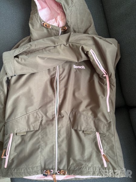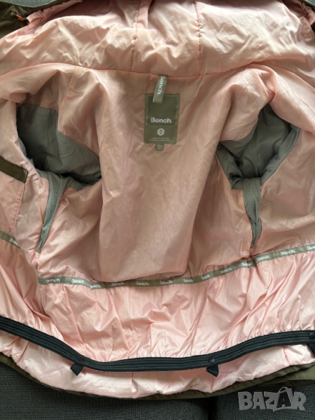 Продавам дамско туристическо яке с качулка Bench в зеленикавокафяво с розова подплата.