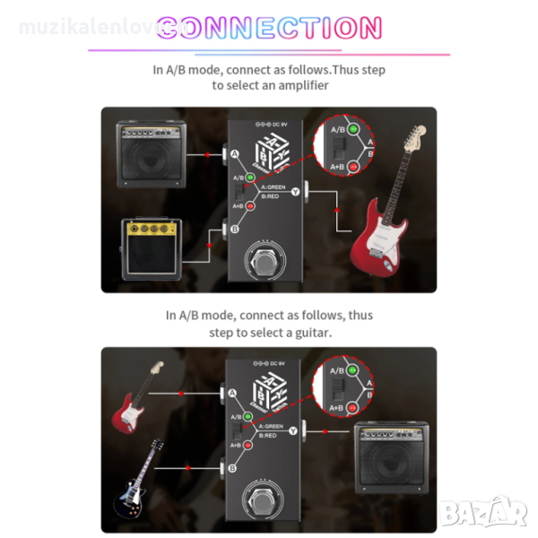 Guitar Pedals ABY Box Line Selector AB Switch Mini Guitar Effect Pedal Bidirectional Transmission Metal Casing Anti-slipПедалчетата са чисто нови в неразпечатвани оригинални опаковки.Отлична цена и отлично качество.-------------------------------------------------Specifications:Input Power: DC 9V ≥ 300mAA/B/Y Jack: 1/4 "mono audio jackColor: BlackItem Size: 8.8 * 4 * 2.5cm/3.5 * 1.6 * 1 inchItem Weight: 146g/5.1ozNote:Due to the different display screen and light effect, the actual color of the item might be slightly different from the color showed on the pictures.Packing List:1 x Electric Guitar Effect Pedal1 x Instructions----------------------------------------------------------------Моля вижте снимките и характеристиките!!!За поръчки през системата на базар или Viper: 0894341978ОБЯВЕНАТА ЦЕНА Е ЗА 1 бр.