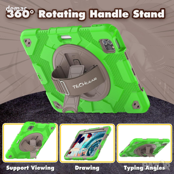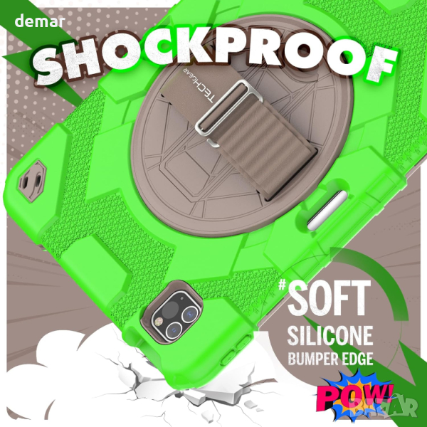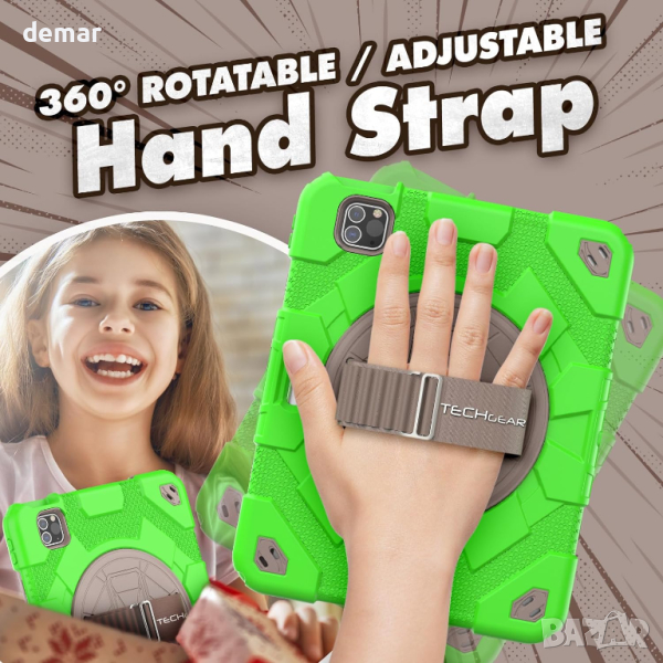 Детски калъф TECHGEAR iPad Air 10.9"/Pro 11, здраво защитно решение, предназначено за iPad Air 5-то и 4-то поколение 10.9" екран и iPad Pro 11" 4-то и 3-то поколение модели. С 3 слоя защита с мека дебелина на въздушната възглавница TPU броня, твърд Заден калъф от РС и 2 рамки за преден екран, включително една с вграден протектор за екран и една без. Капаците за лесен достъп до портове, изрези за камера, микрофон и високоговорители и вградените бутони за сила на звука и захранване осигуряват удобство. Калъфът също така може да се похвали със здрава 360-градусова въртяща се стойка за хоризонтално и вертикално гледане, което го прави идеален за презентации и пътуване.Освен това, той се предлага с подвижна и регулируема презрамка за лесно носене и дръжка за ръка за сигурно използване с една ръка, идеално за училище, вкъщи и приключения в движение.